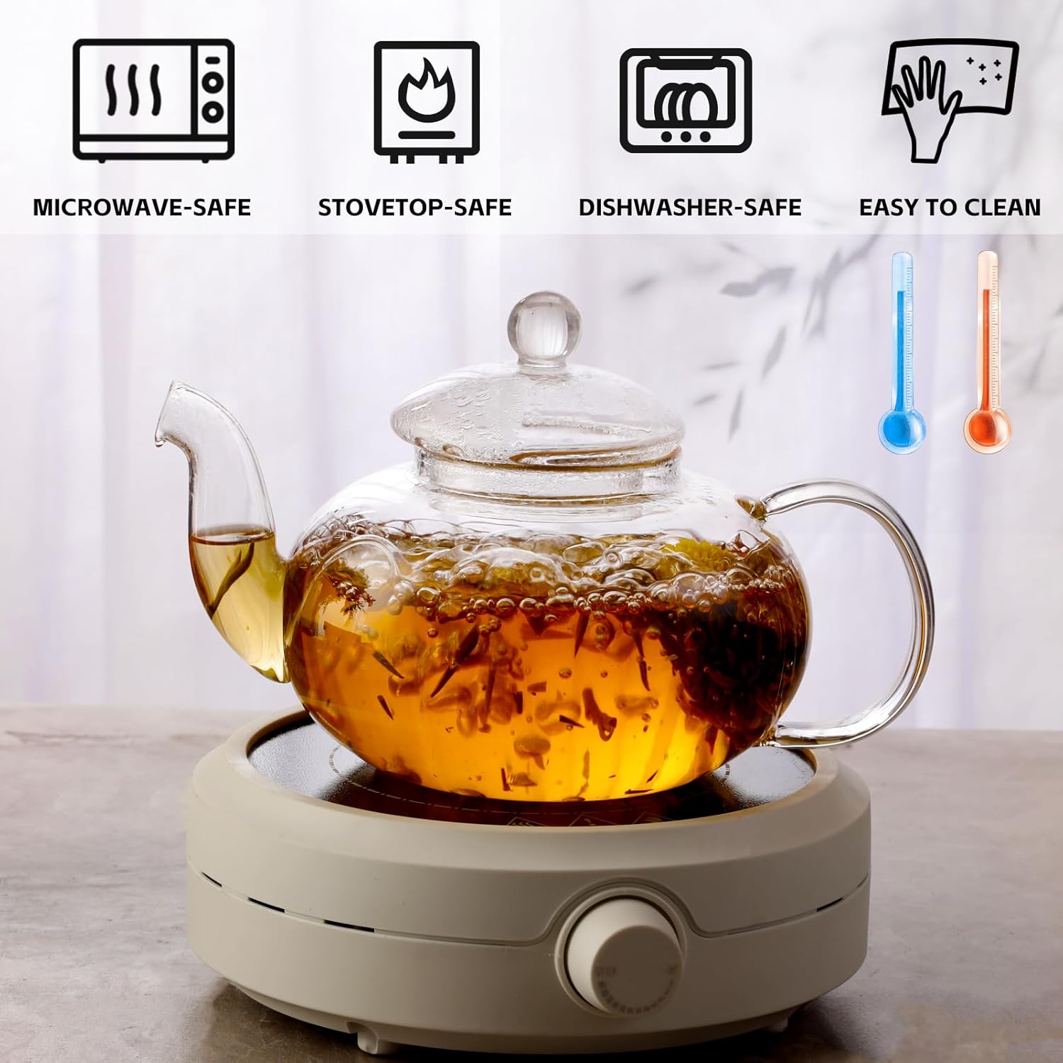 - PREMIUM-QUALITY MATERIAL : The glass teapot set is crafted of high quality borosilicate to ensure the purity and clean taste of your beverage, precision engineered for the utmost in high performance and heat resistance and functionality. It can be placed on the induction cooker and open fire for heating, in the case of alternating cold and hot can also prevent cracking.
