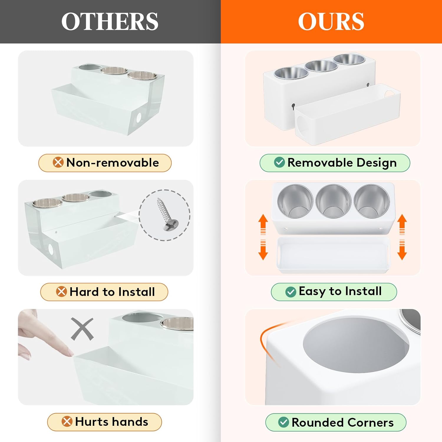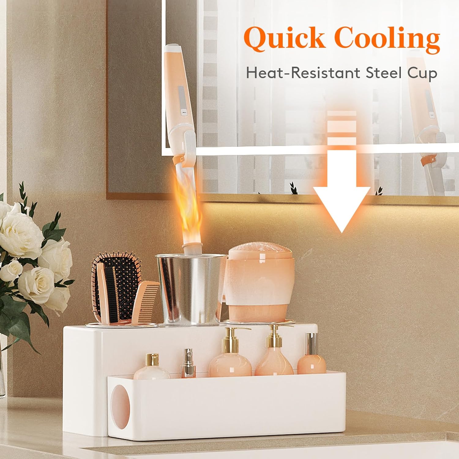 - Heat-Resistant Tool Rack: This hair dryer holder features three heat-resistant stainless steel cups to serve as stands for hair dryer and curling iron, allowing them to cool down quickly. With a deep design, the cups provide stability and prevent tipping