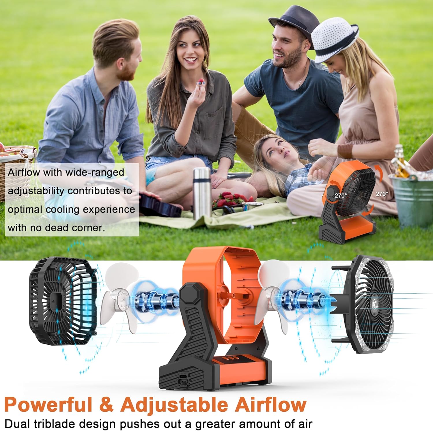 - DOUBLE TRIBLADE & 270Β° PIVOT: The camping fan with double triblade design to put on more powerful airflow than the ordinary others. Plus 4 different speeds to meet your different demands. A 270Β° pivoting head enables to cool you down instantly in whichever direction you like